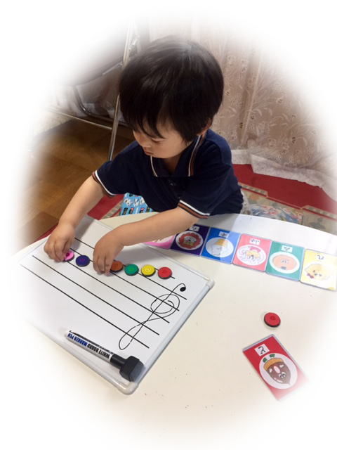 導入レッスンでは、音楽に合わせて体を動かしたり、おうた遊びをしたり、クレヨンを使って色塗りをしたり、シール張りをしたり、カードを使ったり・・・と、子供たちにとっては